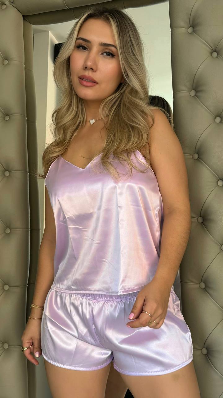 Referencia 11410 LINDA FANTASTIC: Conjunto Pijama de short y blusa de tiras, fabricada en tela Satin, la cual proporciona una sensación de suavidad, delicadeza y elegancia a la vez que cuenta con elongación, la cual permite la comodidad perfecta para dormir. Viene en una amplia gama de colores. Cuenta con 3 tallas: S/M, L y XL.