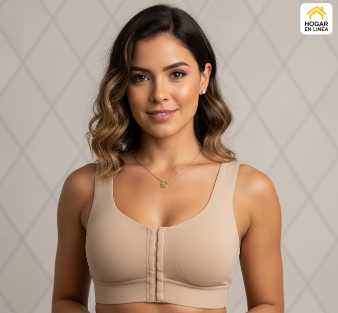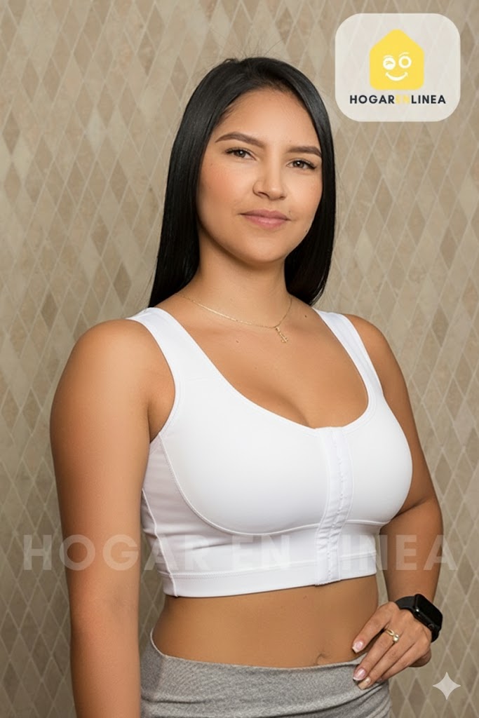 PRODUCTO BRASIER CORRECTOR DE POSTURA Brasier corrector de postura con refuerzo en ”X” elaborado en doble capa de Powernet. Es Ideal como Postquirúrgico: controla y da soporte a tu busto, ajustándose perfectamente a tu cuerpo.Cubre tus laterales para disimular los rollitos bajo el brazo, además sus copas suaves y ligeras, modelación al natural redondeada. Banda ancha bajo el busto, sin arco ni elásticos, que te ayuda a soportar su peso durante todo el día. Ajuste perfecto: abrochadura frontal con 3 niveles de ajuste que lo hacen muy fácil de poner e imperceptible bajo la ropa. Combina lo Elegante y lo Deportivo, tela fresca. LO TENEMOS EN COLOR BLANCO, BEIGE Y NEGRO.