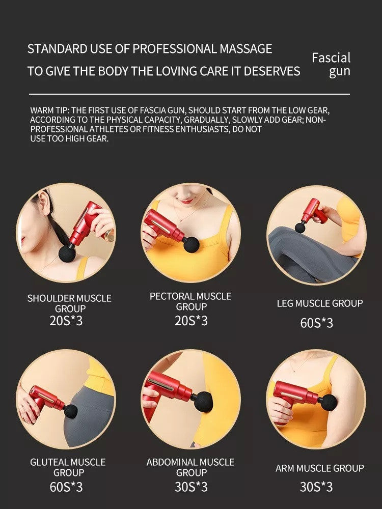 Pistola De Masaje De Percusión De Tejido Profundo 4 En 1 Características destacadas Pistola de masaje muscular profesional: El masajeador eléctrico portátil inalámbrico de la palma de la mano tiene un diseño hermoso y una fuerte vibración multifrecuencia. Puede aliviar eficazmente la rigidez muscular y el dolor, optimizar la circulación sanguínea y el rango de movimiento, y mejorar el Estado de salud de los tejidos blandos del cuerpo. Larga vida útil de la batería: Pistola de masaje integral, batería de litio con capacidad 1800 mAh, larga vida útil de la batería. El masajeador de tejido profundo está equipado con baterías recargables que funcionan de 3 a 5 horas. Para satisfacer los requisitos de ahorro de energía y seguridad, la pistola de masaje se apaga automáticamente después de 10 minutos de uso. Diseño muy tranquilo y ergonómico: El mango ergonómico minimiza las vibraciones externas, lo que hace que el masajista sea más relajado y cómodo con una pistola de masaje muscular, utiliza una técnica de silencio única. 4 Cabezas de Masaje & 8 Velocidades: Cabeza Redonda, cabeza plana, cabeza de horquilla, esfera de cabeza plana. Con vibraciones de alta frecuencia (1600 - 3000 veces por minuto), puede ajustar la frecuencia, elegir diferentes cabezas de masaje, le permite masajear los músculos de cada esquina del cuerpo, aliviar eficazmente la rigidez muscular, el dolor y el dolor. Un regalo perfecto: La pistola de masaje puede relajar su cuerpo, aliviar el estrés mental y hacer que su cuerpo sea más saludable que nunca antes. También alivia el dolor, la sensibilidad y el dolor en los músculos y articulaciones. Es un regalo ideal para la familia o los amigos. NOTA : Se envía sujeto a disponibilidad de color ESPECIFICACIONES: Velocidad/Frecuencia: 1200-3200 RPM Capacidad de la batería: 1800 mAh Potencia nominal: 60 W-80 W Número de cabezales de masaje: 4Horas de trabajo: más de 1 hora después de la carga completa, dependiendo de la velocidad que hayas utilizado Tiempo de carga: 2,5 a 3 horas Modo de carga: carga USB Material: ABS Engranaje: 6 engranajes Control Ruido acústico: 45 db Voltaje nominal: DC110-220VAmplitud: 6 mm Tamaño de la pistola fascia /Peso: 13.3 * 13* 5 cm/0.6 kg Color según disponibilidad POR TU COMPRA RECIBES: 1 Pistola de masaje4 Cabezal de masaje1 Cable USB1 Manual del usuario en ingles1 Caja exterior GARANTÍA ¿Tu producto tiene alguna novedad que debamos reportar?* Una vez recibas tu producto, cuentas con máximo 5 días para reportar a Soporte: piezas faltantes, rotas o cualquier novedad que presente el producto.*¿No era lo que esperabas?* Aplica Ley retracto Durante 5 días, contados a partir de la recepción del producto, para la devolución, ten en cuenta que debe estar en las condiciones que se recibió, con su empaque original, con las etiquetas, sellos de seguridad, y contar con todas sus partes y/o accesorios. Sin rayones ni manchas. Se recibirá únicamente en óptimas condiciones. Se anulará automáticamente el derecho a retracto si el producto fue usado.*¿Tu producto está presentando fallas?* Cuentas con 30 días de garantía por funcionamiento y/o daños del producto que no estén relacionados a su mal uso. Para hacer efectiva la devolución, el producto debe entregarse debidamente protegido cuidando el estado del empaque original, incluir todos los documentos y/o manuales (si aplica) y las partes completas